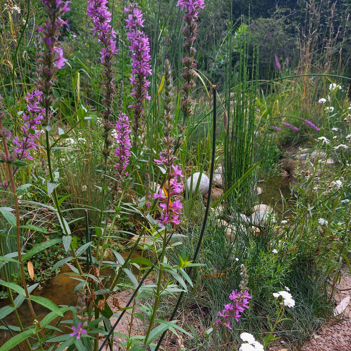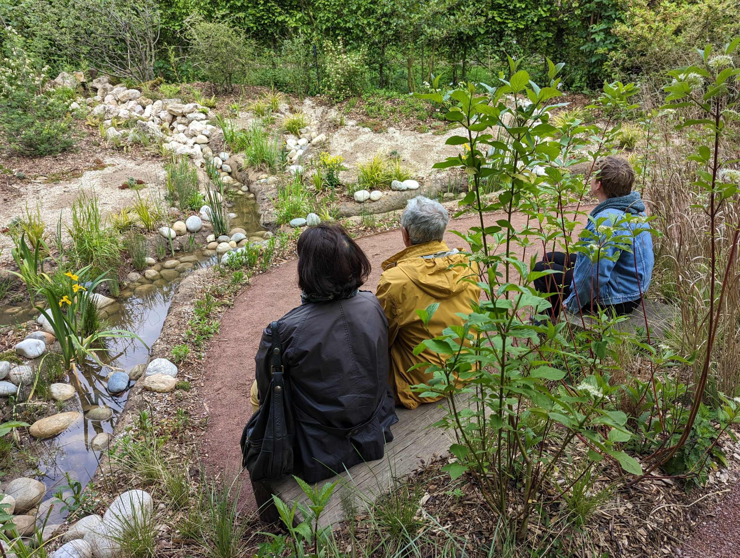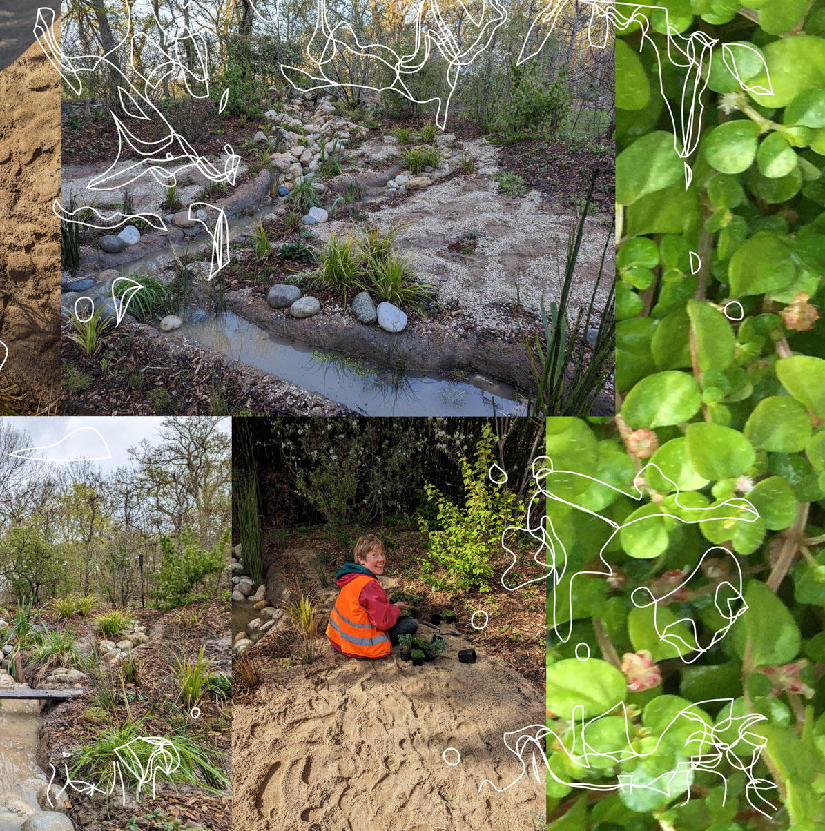 La végétation qui compose le jardin est inspiré d’une palette locale et sauvage. Elle contribue à fournir à la faune un abri nourricier accueillant. Nous, visiteur.euse.s humain.e.s, sommes invité.e.s dans ce lieu par celleux qui y vivent. Les chemins nous tiennent un peu à distance pour que les rencontres soient choisies, protégeant l’intimité de la faune tout en nous laissant une chance de l’entrevoir.
