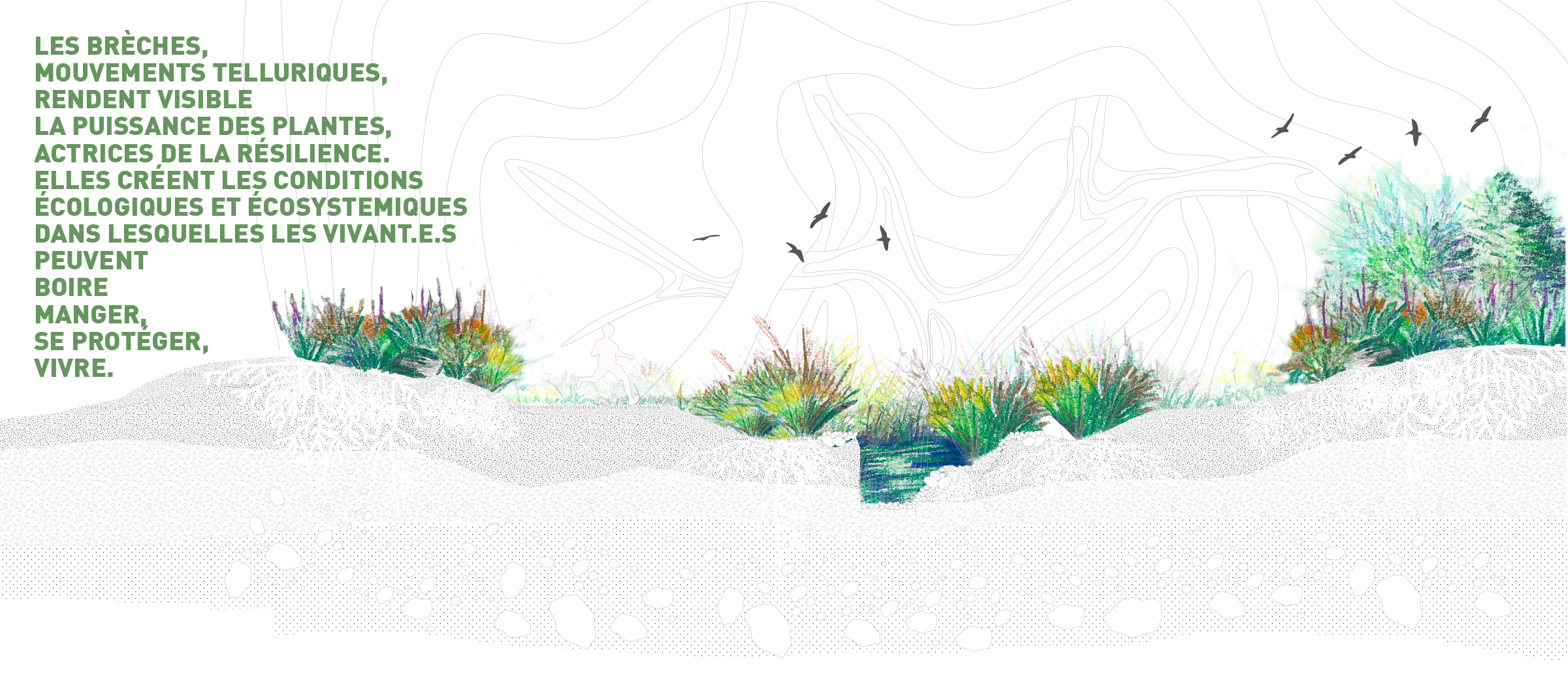 Réalisé dans le cadre du festival international des jardins de Chaumont-sur-Loire, le jardin brèche est une réalisation poétique et militante qui cherche à démontrer la résilience par sa dynamique fougueuse et sauvage.